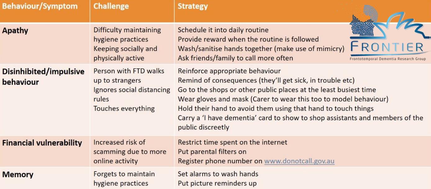 For carers, we understand that dementia can cause challenging behaviours. These are all common symptoms of dementia, and the strategies listed here can help manage these symptoms.