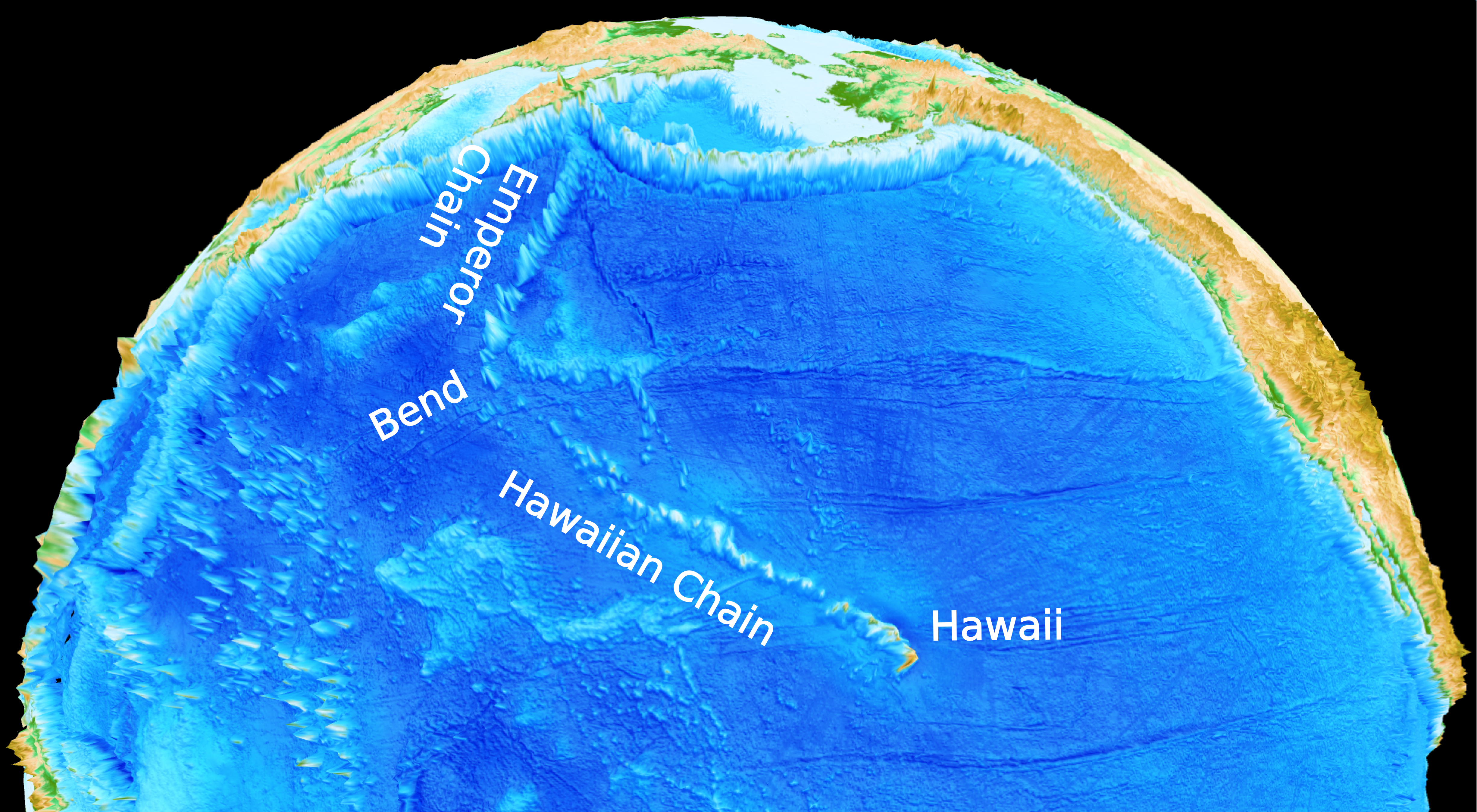 Between 50-100 million years ago, the edge of the pile under the north Pacific was pushed rapidly southward, along with the base of Hawaii’s volcanic plume, causing it to tilt. The plume became vertical again once the motion of its base stopped; this dramatic start-stop motion resulted in the seamount chain’s sharp bend.
