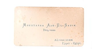 The name on the yellowing card is Mustapha Abd-El-Sadik, a dragoman who offered his services to foreign soldiers in Egypt during the First World War. He would have arranged visits to sites and helped purchase antiquities as souvenirs.