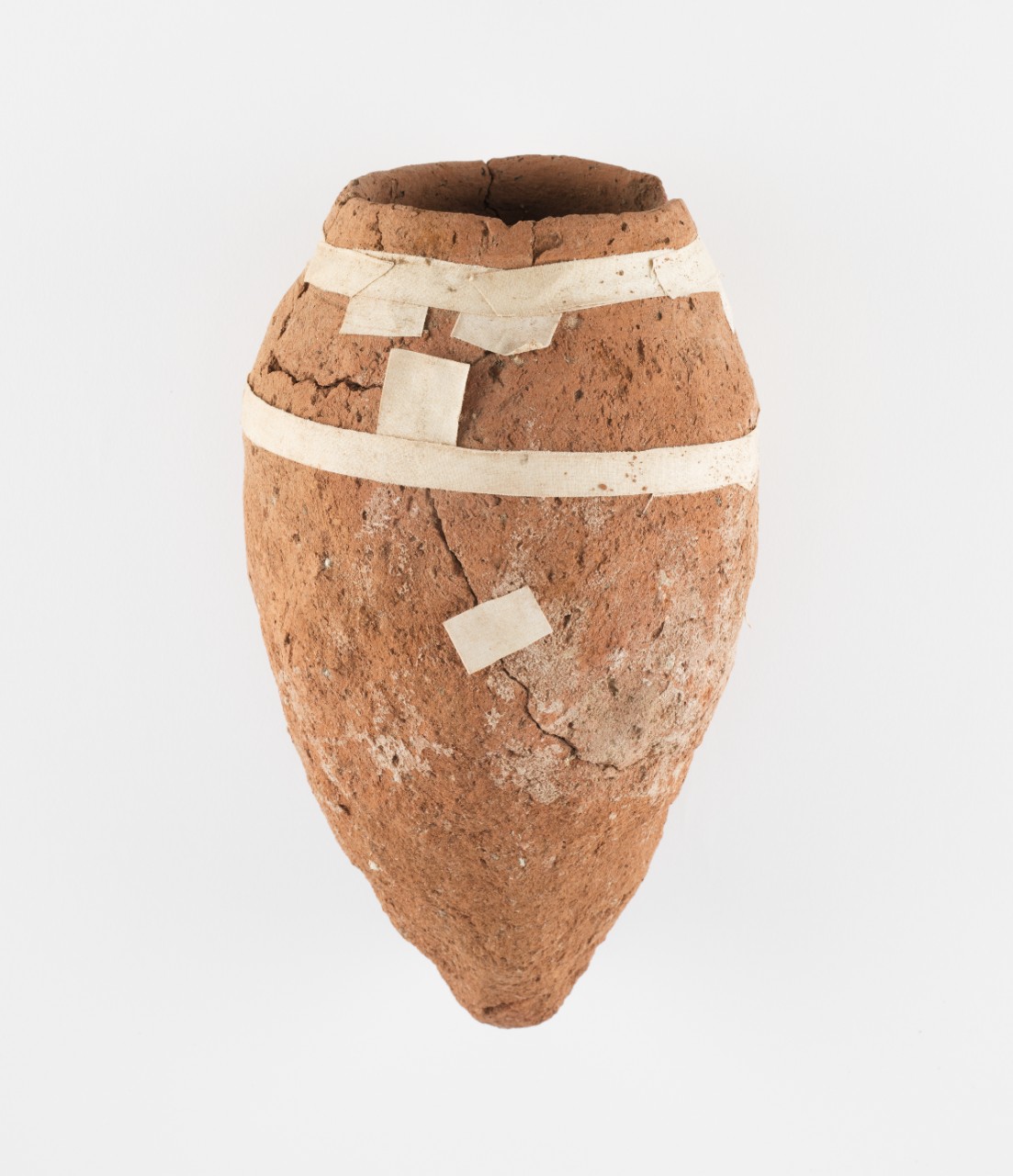 The broken jar has been reconstructed with medical tape. Once upon a time it might have been used to store an animal mummy.