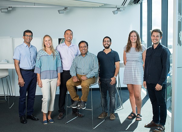 2018 Sydney Postdoctoral Fellows (from left) Dr Hamid Arandiyan, Dr Brigitte Sommer, Dr Stefan Oehlers, Dr Jonathan Danon, Dr Rachael Dodd, Dr Zac Chatterton, with 2017 Fellow Dr Mohammad Ali Moni (centre, seated), who started in December.
