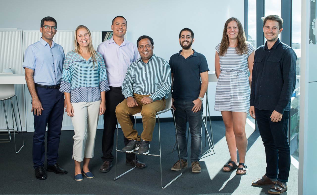 Some of the 2018 University of Sydney Fellows (from left) Dr Hamid Arandiyan, Dr Brigitte Sommer, Dr Stefan Oehlers, Dr Jonathan Danon, Dr Rachael Dodd, Dr Zac Chatterton, with 2017 Fellow Dr Mohammad Ali Moni (centre, seated).