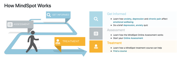 As an example, Mindspot offers a three step online process of therapy, beginning with information, followed by assessment, and finally, treatment.