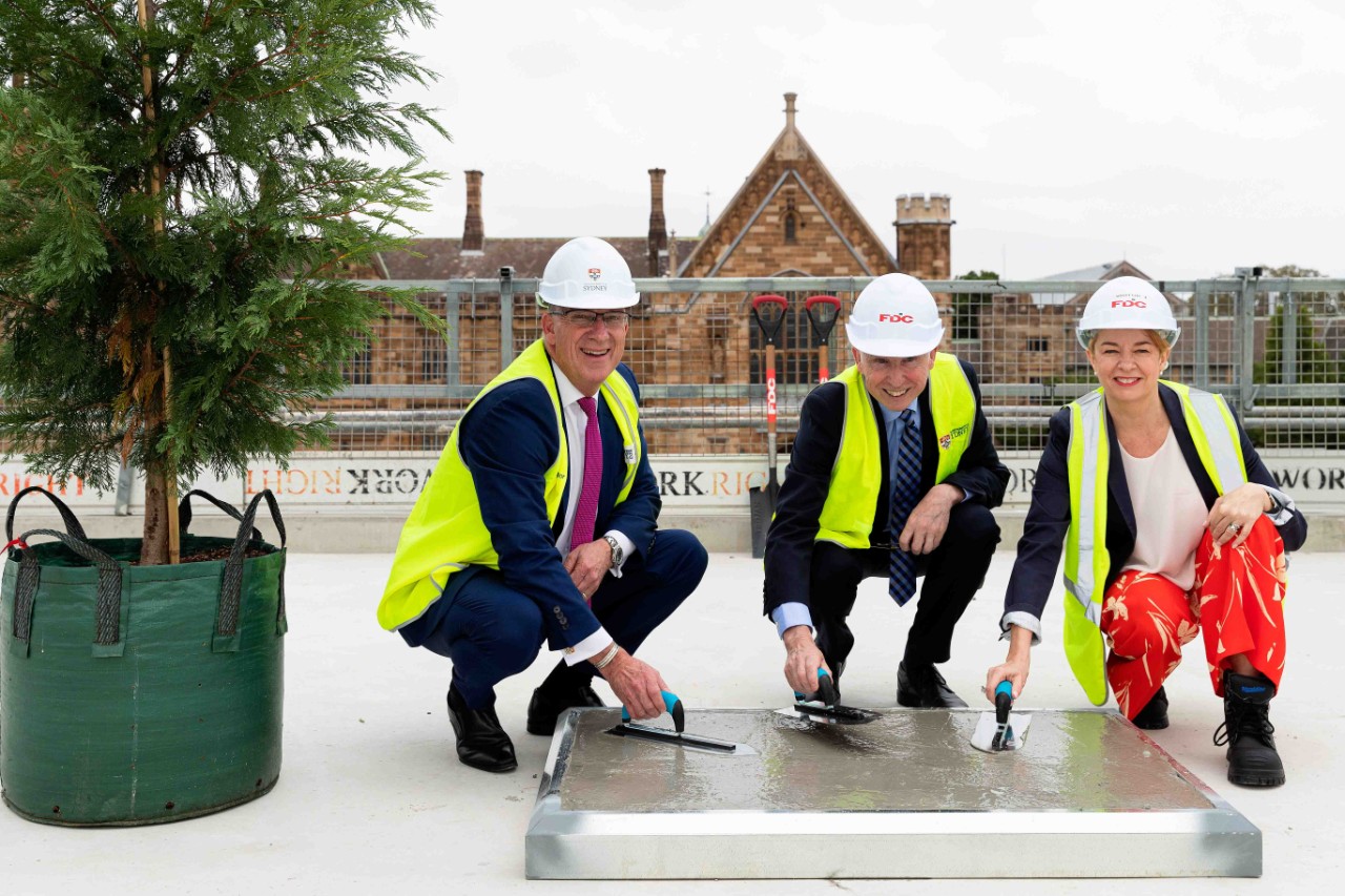 (L-R): Vice-Chancellor and Principal Dr Michael Spence, Director of Museums and Cultural Engagement David Ellis and Vice-Principal (External Relations) Tania Rhodes-Taylor trowel the last section of concrete on the Chau Chak Wing Museum.