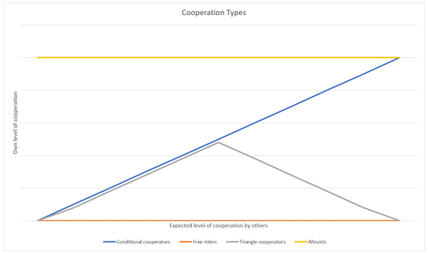 This infographic illustrates the four cooperation types and levels of cooperation over time. Altruistiic cooperation does not depend on others. Conditional cooperation depends on others cooperating. Triangle cooperation is similar to conditional cooperation to a point, then falls away. Free-riding behaviour is always uncooperative and can only be modified by the fear of punishment.