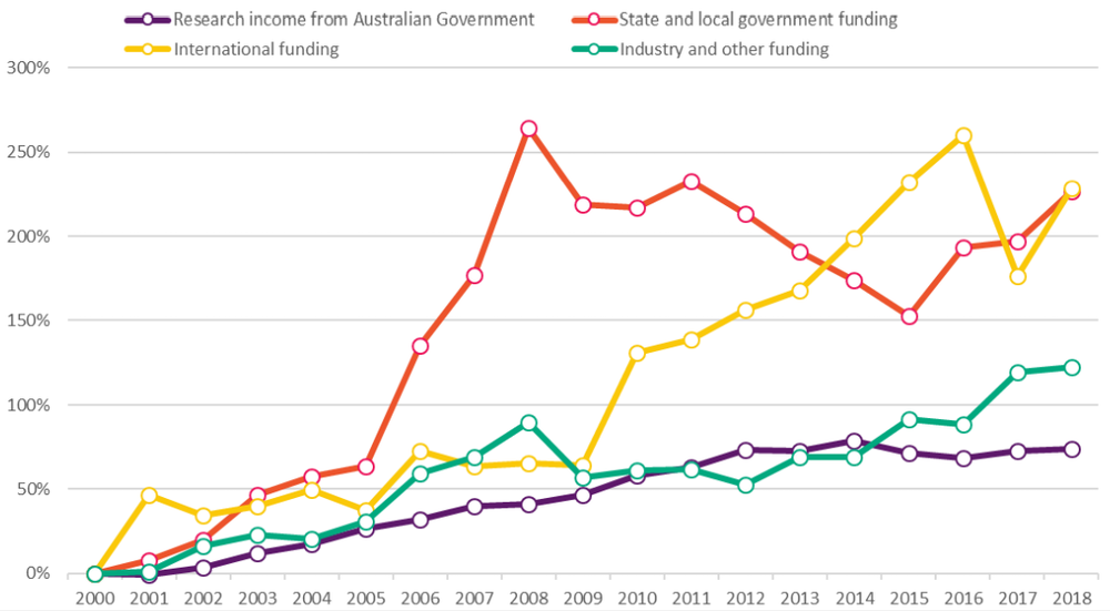 Growth in sources of funding for university research since 2000 (in 2018 dollars) Universities Australia, CC BY