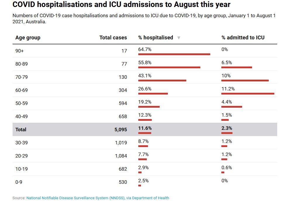 Australian data from January 1 to August 1 this year show 2.5% of children aged up to nine and 2.9% children and teenagers aged 10-19 who contracted COVID were hospitalised. This is compared to 7.7% of young adults aged 20-29, with the rates continuing to increase with age.