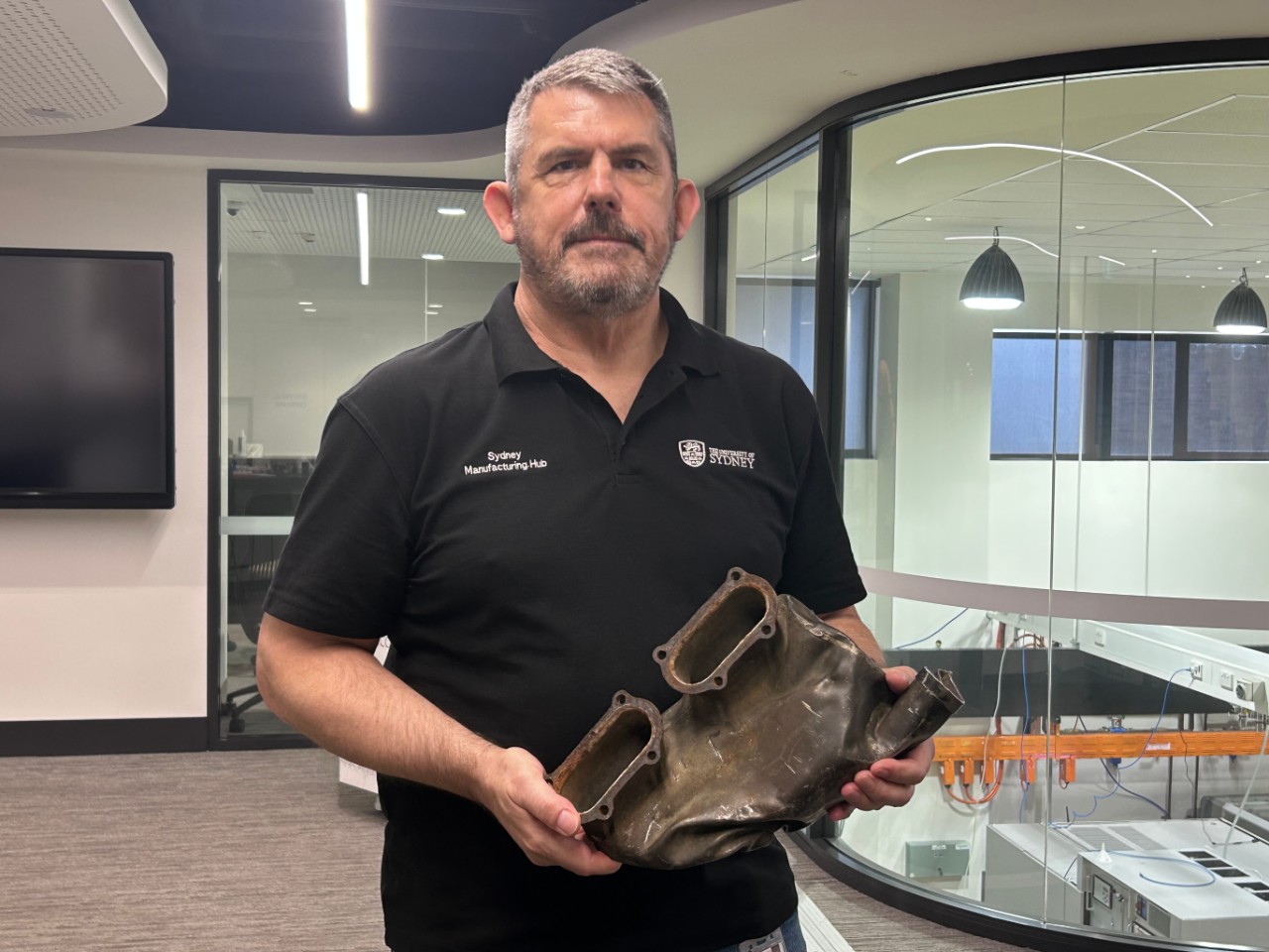Bruce Mclean, Chief Engineer at the Sydney Manufacturing Hub who is leading the restoration of Sandy's Spitfire recovered by the AA810 Spitfire Project. He is pictured with the one of the aircraft's original manifolds, which was flown to Australia in April. Image: University of Sydney