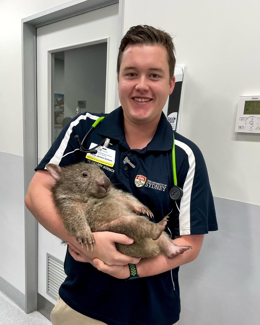Harry with a bare-nosed wombat receiving care in a wildlife rehabilitator centre.